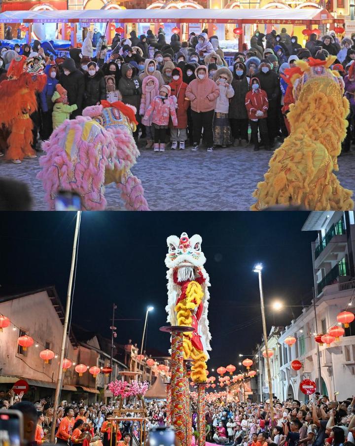 拼版照片:上圖為市民在沈陽新春皇寺廟會(huì)上觀看舞獅表演(2023年1月23日新華社記者楊青攝)。下圖為人們?cè)隈R來西亞檳城廟會(huì)上觀看舞獅表演(2025年2月1日新華社發(fā)李奕慧攝)。