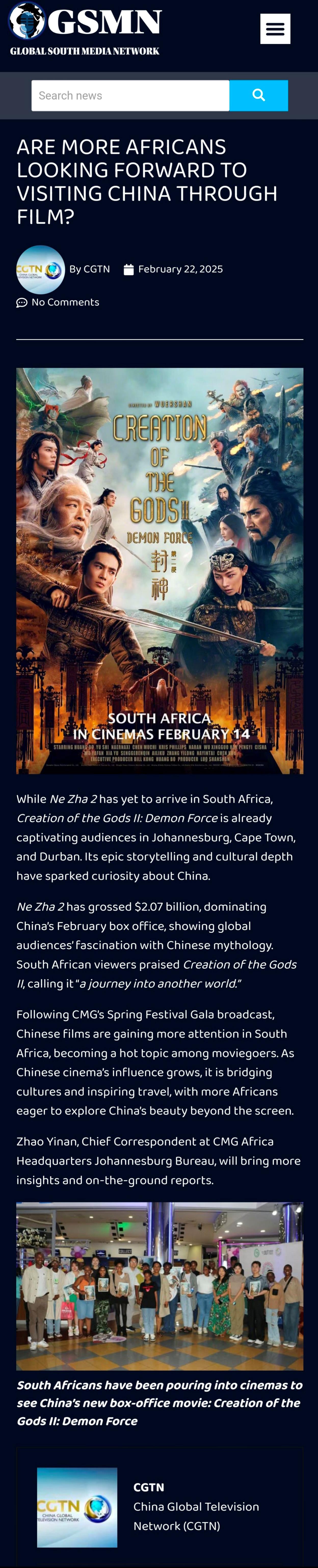 此外,中國春節(jié)檔電影登陸非洲并引發(fā)廣泛影響的相關(guān)報道被肯尼亞廣播公司、南非獨立傳媒、南非《外交圈報》、全球南方新聞網(wǎng)、贊比亞5fm電臺、津巴布韋廣播公司、岡比亞之聲、剛果新聞網(wǎng)等多家媒體轉(zhuǎn)引轉(zhuǎn)載,觸達超1億受眾。
