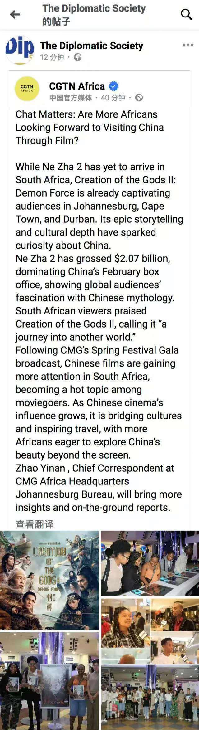 電影連接世界,這一次,非洲大陸期待著《哪吒2》的到來,曼德拉廣場上舞動著南非版的“魔童鬧?!薄侵迺r刻已到——This time for Africa!