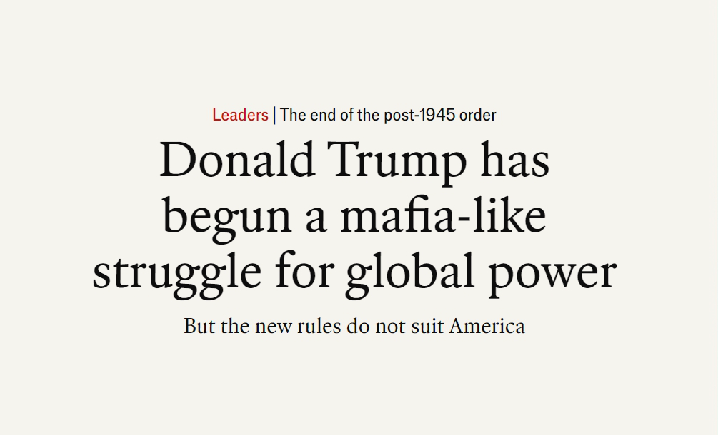 英國(guó)《經(jīng)濟(jì)學(xué)人》網(wǎng)站近期刊文稱(chēng),美國(guó)總統(tǒng)特朗普已經(jīng)開(kāi)啟一場(chǎng)黑手黨式的全球權(quán)力爭(zhēng)奪。1945年后建立的世界秩序正在加速撕裂。一個(gè)強(qiáng)權(quán)即公理、小國(guó)受欺負(fù)的世界正快速到來(lái)。文章摘要如下: