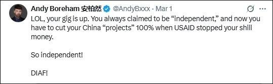“笑死,你們?nèi)嗽O(shè)崩了?!痹谥袊詈凸ぷ鞫嗄甑男挛魈m媒體人安迪·博勒姆(中文名安柏然)也嘲諷道,“成天標(biāo)榜自己‘獨立’,現(xiàn)在美國國際開發(fā)署斷了黑錢,對華‘項目’得100%砍光。還真是獨立啊!趕緊涼透吧!”