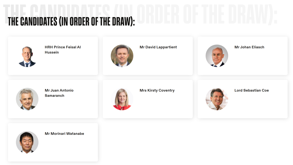 此次國際奧委會(huì)主席選舉共有創(chuàng)紀(jì)錄的七人參與,包括國際奧委會(huì)副主席小薩馬蘭奇,國際奧委會(huì)執(zhí)委、運(yùn)動(dòng)員委員會(huì)前主席柯絲蒂·考文垂,世界田聯(lián)主席塞巴斯蒂安·科,國際自行車聯(lián)盟主席大衛(wèi)·拉帕爾蒂安,國際雪聯(lián)主席約翰·埃利亞施,國際奧委會(huì)執(zhí)委費(fèi)薩爾·侯賽因和國際體操聯(lián)合會(huì)主席渡邊守成。