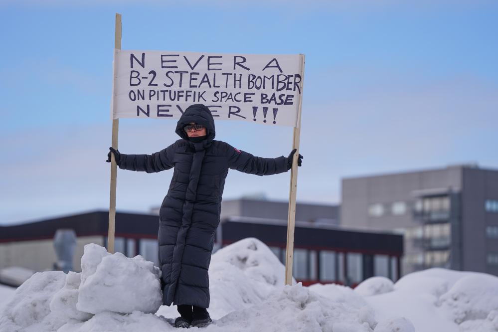 3月28日,在丹麥自治領(lǐng)地格陵蘭島首府努克,一名女子舉著抗議標(biāo)語。新華社記者彭子洋攝