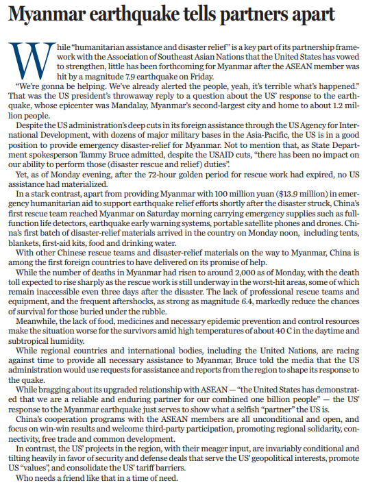 “人道主義援助和救災(zāi)”是美國與東盟伙伴關(guān)系的重要內(nèi)容,美國也信誓旦旦地宣稱要加強(qiáng)救援合作,但截至3月31日下午,緬甸地震72小時救援黃金時間已經(jīng)過去,緬甸當(dāng)?shù)厝晕闯霈F(xiàn)美國救援隊(duì)的身影。