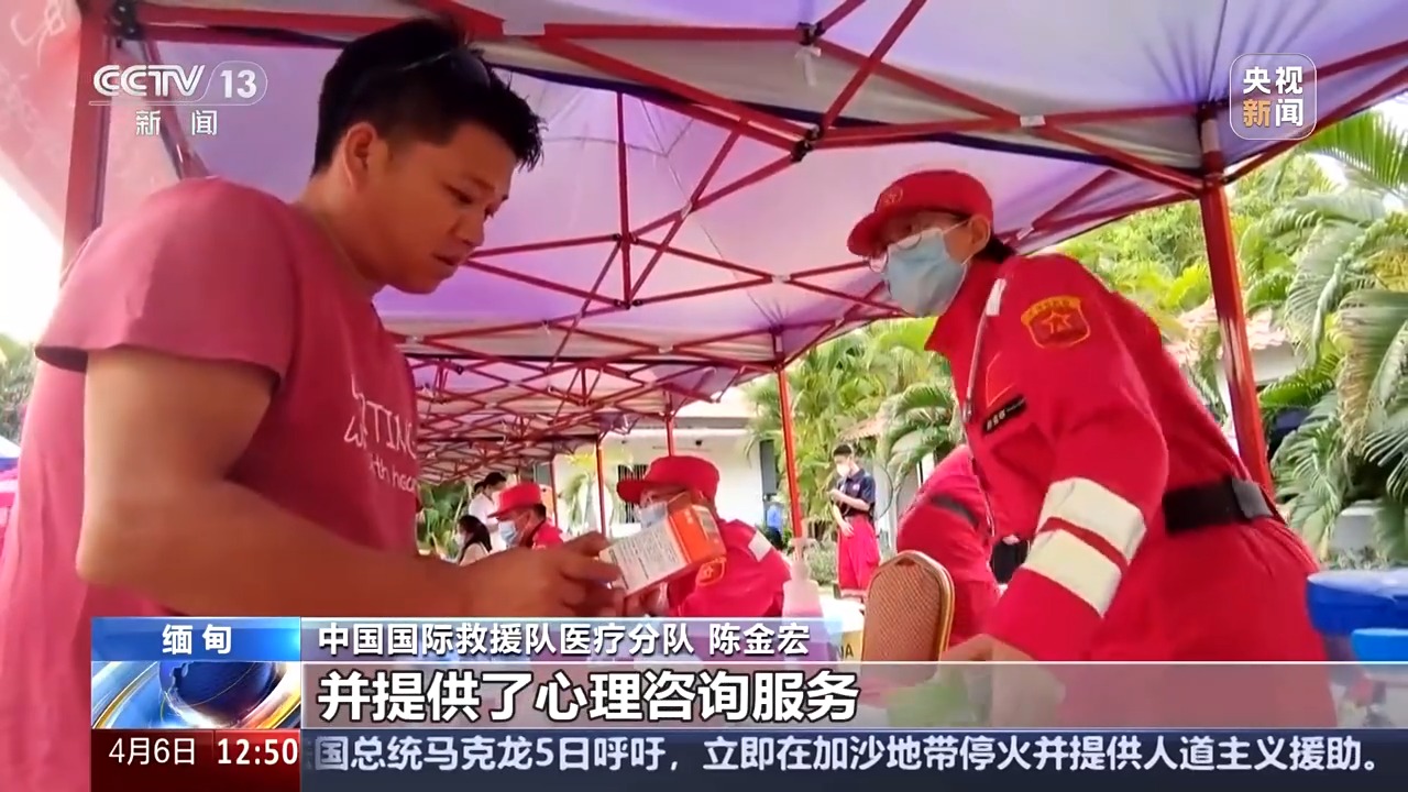 中國國際救援隊醫(yī)療分隊 陳金宏:今天我們來到這里,開展內(nèi)外婦兒診療,進(jìn)行防疫消殺的培訓(xùn),并提供了心理咨詢服務(wù),下一步結(jié)合曼德勒市傷情災(zāi)情,我們會持續(xù)為當(dāng)?shù)貫?zāi)民做好醫(yī)療服務(wù)。