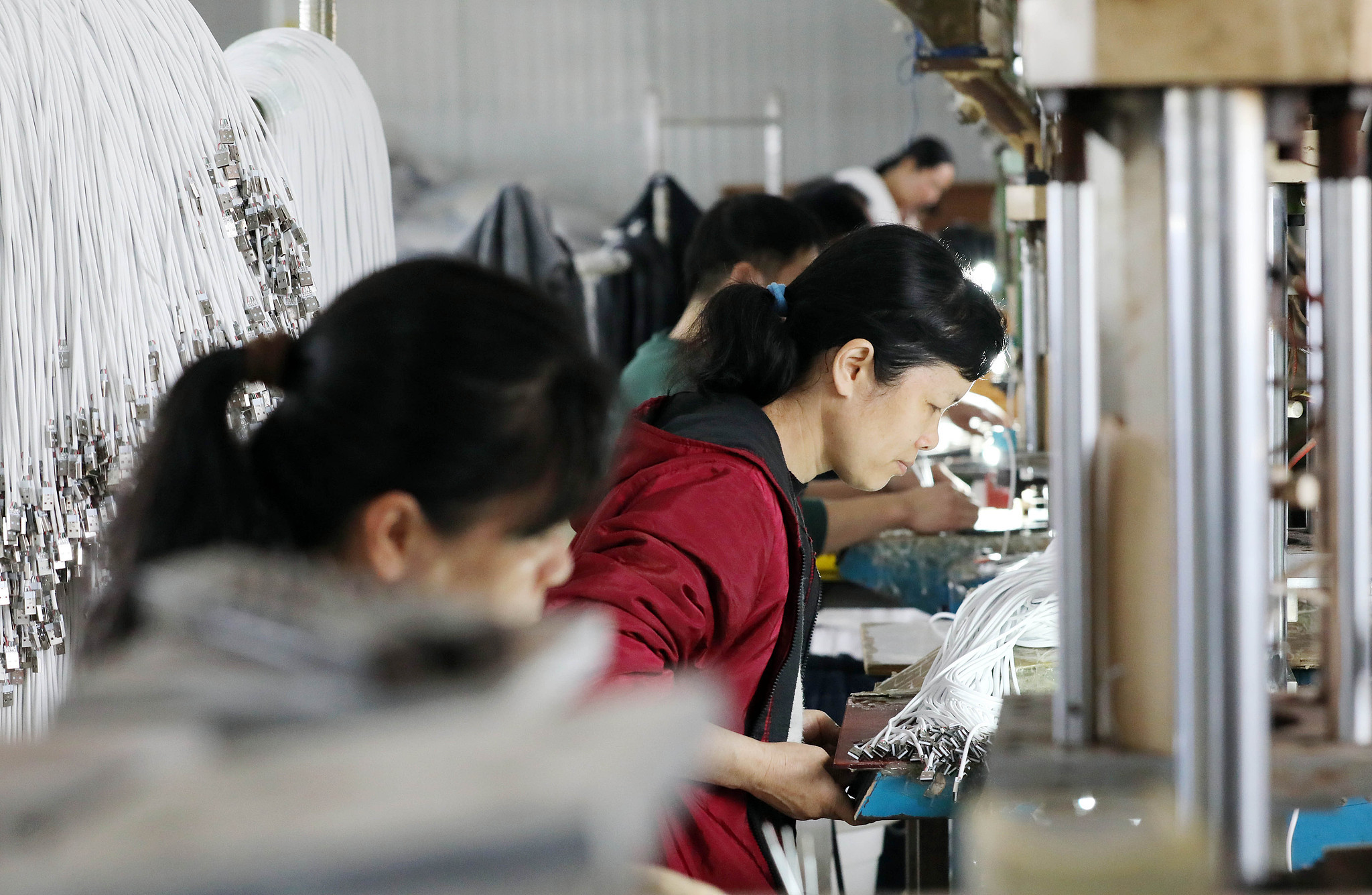 △廣西柳州一家電子廠生產車間,工人在生產線上加工數(shù)據(jù)線等電子產品。