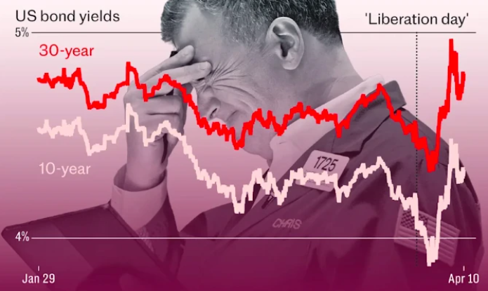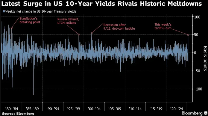 行情數(shù)據(jù)顯示,截止本周五收盤,素有“全球資產(chǎn)定價之錨”之稱10年期美債收益率已創(chuàng)下了逾20年來的最大單周漲幅(收益率與債券價格反向),因投資者持續(xù)撤出美國資產(chǎn)。