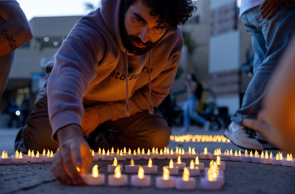 2024年10月7日,新一輪巴以沖突爆發(fā)一周年之際,在美國加利福尼亞州洛杉磯,加利福尼亞大學(xué)洛杉磯分校的學(xué)生們參加集會活動時點亮蠟燭。新華社/美聯(lián)