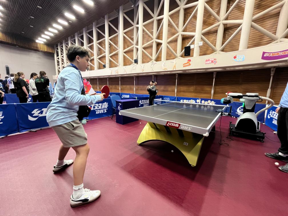 二樓體驗區(qū)的乒乓球發(fā)球機器人前,學生們輪番挑戰(zhàn)。曾在美國全國U14乒乓球比賽中拿下過第7名的瑞恩·特洛伊·李揮拍上陣,飛快的反應速度引發(fā)伙伴們此起彼伏的歡呼和掌聲。