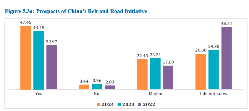 許多受訪者認(rèn)為中國的經(jīng)濟(jì)倡議,如共建“一帶一路”倡議,能夠推動孟加拉國的增長。
