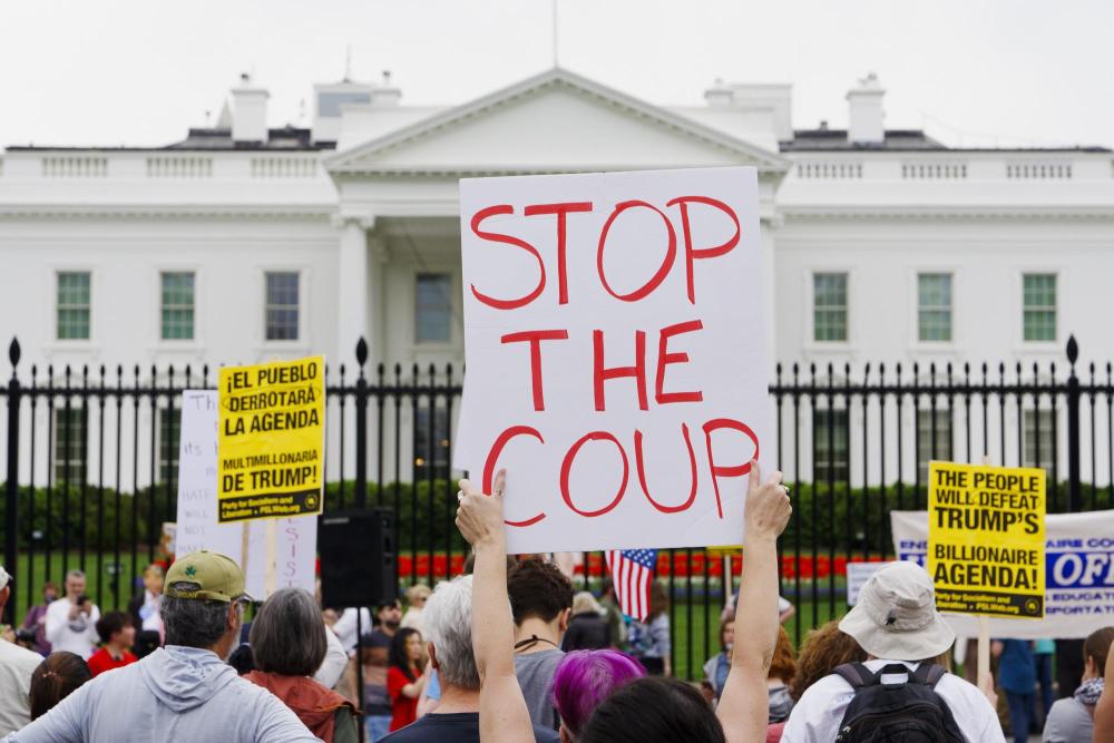4月19日,人們?cè)诿绹?guó)首都華盛頓白宮門(mén)前參加抗議活動(dòng)。美國(guó)多地19日舉行抗議活動(dòng),首都華盛頓、紐約、舊金山、波士頓等城市的民眾走上街頭,抗議現(xiàn)政府大規(guī)模裁員、加征關(guān)稅、驅(qū)逐移民等政策。新華社發(fā)(亞倫攝)