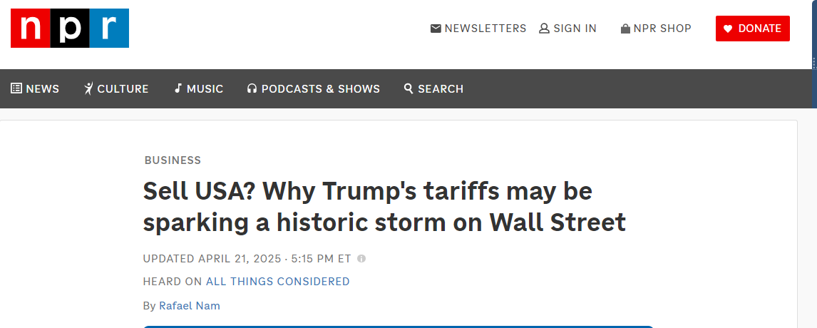 據(jù)美國國家公共廣播電臺(tái)(NPR)網(wǎng)站4月21日?qǐng)?bào)道,美國金融體系過去被視為全球最穩(wěn)定和強(qiáng)大的體系之一。然而,由于美國現(xiàn)任政府4月2日推出的所謂全球“對(duì)等關(guān)稅”政策,美國金融市場(chǎng)出現(xiàn)了前所未有的危機(jī):全球投資者可能因美國政策的不確定性而對(duì)美國失去信心。