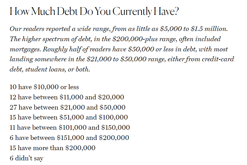 該網(wǎng)站針對102名讀者就個人債務問題進行了調查,了解他們如何背負和償還債務。調查發(fā)現(xiàn),個人債務總額從5000美元到150萬美元不等,20萬美元以上的債務通常包含抵押貸款。約半數(shù)受訪者的債務在5萬美元及以下,最常見的債務范圍在2.1萬美元至5萬美元之間。