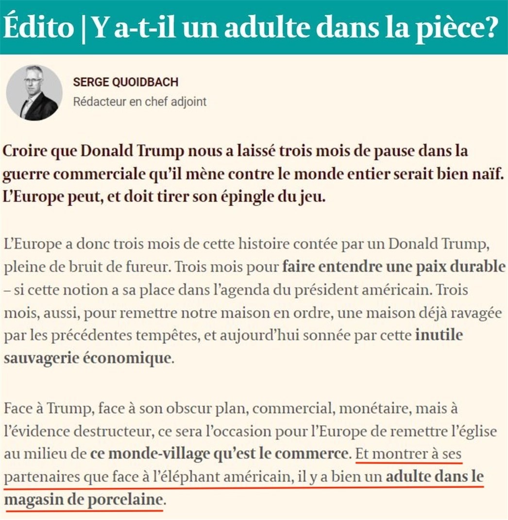 比利時(shí)《回聲報(bào)》近日發(fā)表評(píng)論文章指出,面對(duì)反復(fù)無(wú)常的特朗普政府,歐洲不應(yīng)存有任何幻想,而應(yīng)“直面美國(guó)帶來(lái)的喧囂與動(dòng)蕩”,做好自己的事。