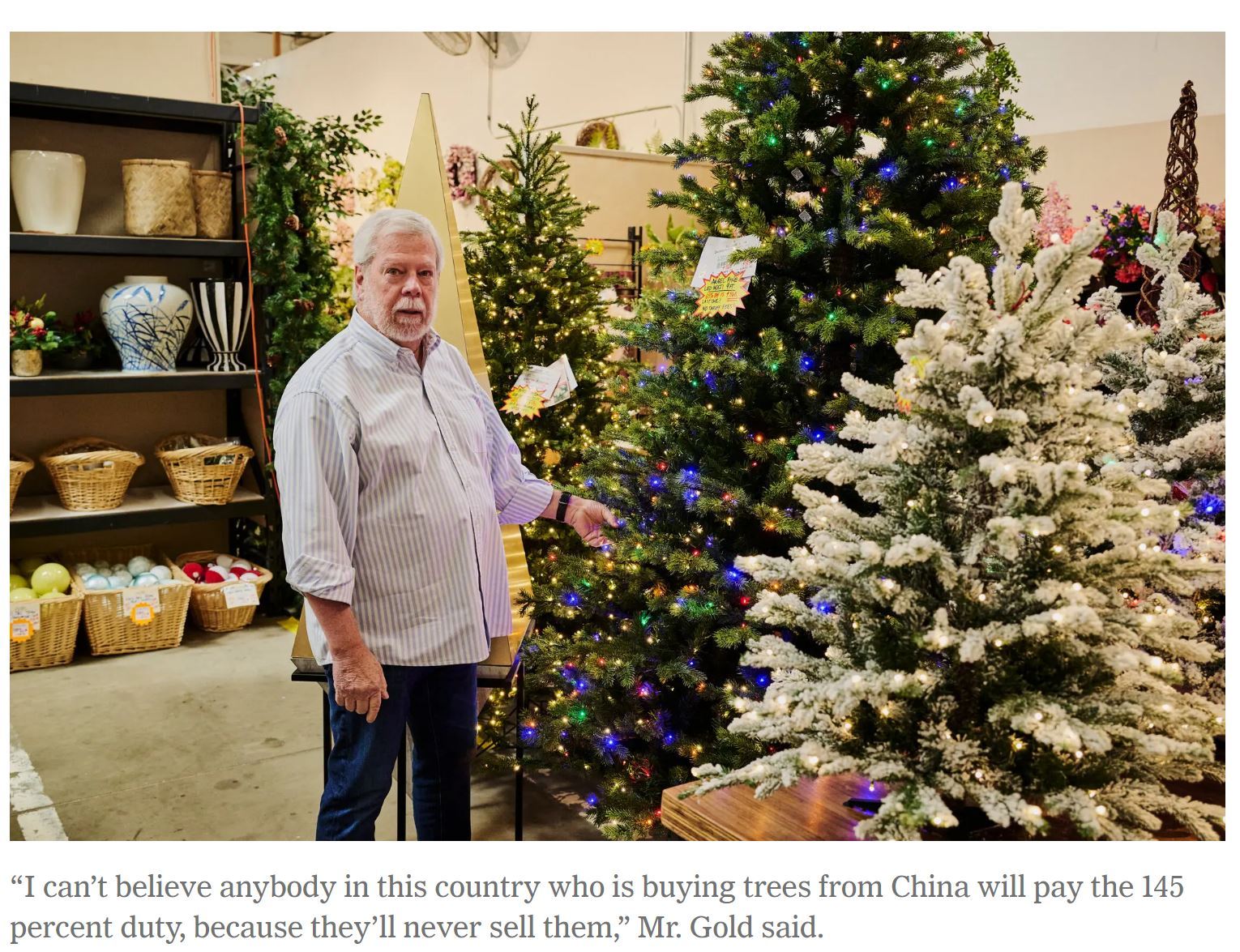 經(jīng)營家居用品的拉里·戈爾德說,去年一棵約2.3米高的圣誕樹在店里的價格大約是1000美元。如今他別無選擇,只能把關(guān)稅成本轉(zhuǎn)嫁給消費(fèi)者,這將使同樣的一棵樹今年的價格超過2000美元。他無奈地表示,這個價格等于“給產(chǎn)品判了死刑”。