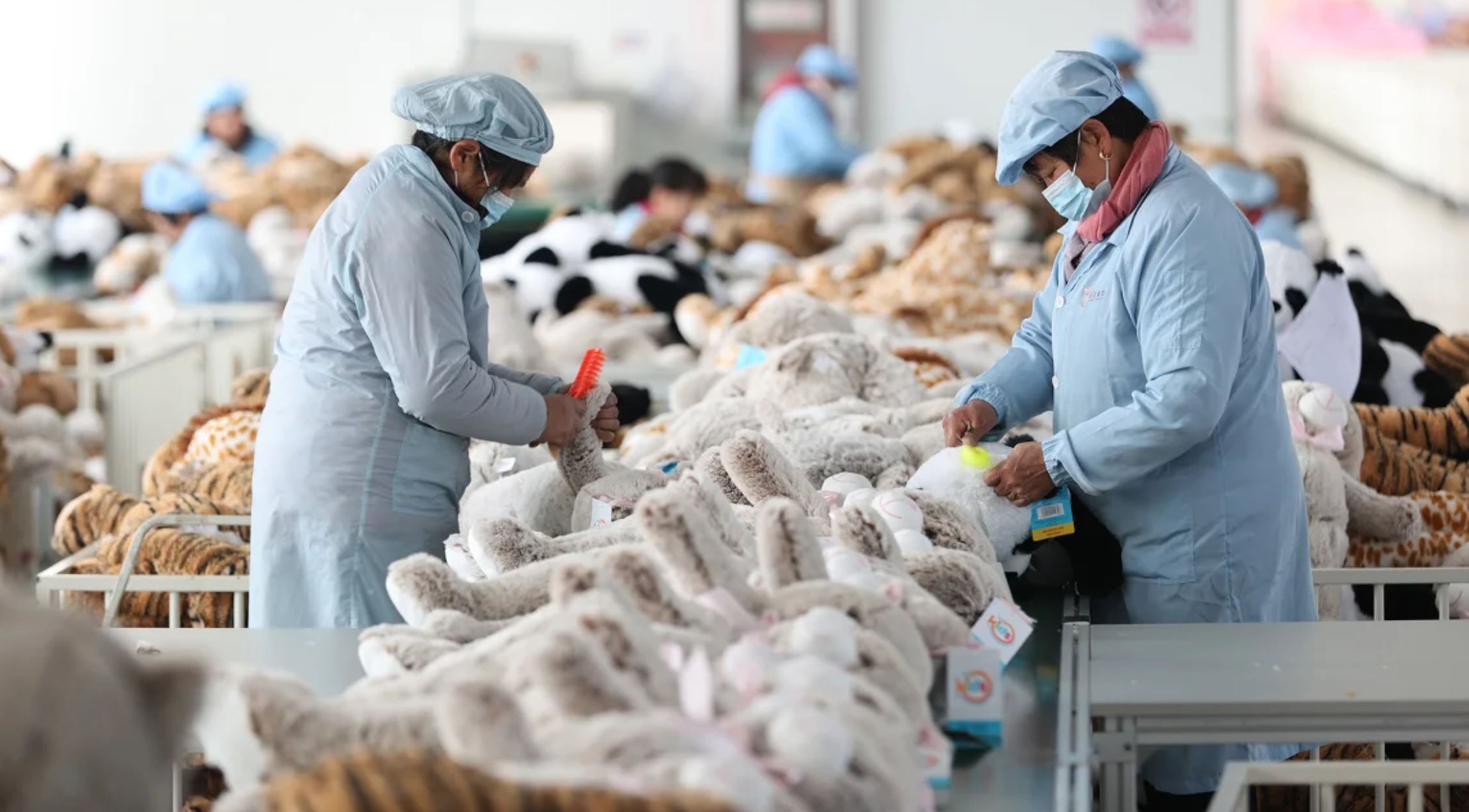 △中國連云港一家玩具制造廠的工人在準(zhǔn)備出口到其他國家的毛絨玩具。(圖自美國有線電視新聞網(wǎng)相關(guān)報道)