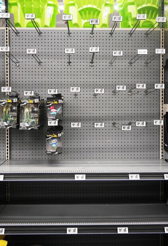 除了價格上漲,這家門店的部分玩具、自行車和家用電器貨架空空蕩蕩,只剩還沒有撤下的價簽。