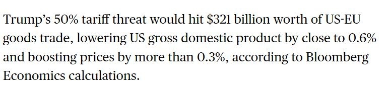 彭博社的計(jì)算結(jié)果顯示,50%的關(guān)稅將影響價(jià)值高達(dá)3210億美元的美歐商品貿(mào)易,一旦征收,將使美國(guó)國(guó)內(nèi)生產(chǎn)總值(GDP)下降近0.6%,物價(jià)上漲超過(guò)0.3%。