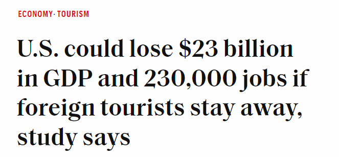 經(jīng)濟分析公司Implan首席經(jīng)濟學(xué)家珍妮弗·索瓦爾德森(Jennifer Thorvaldson)測算稱,基于3月份外國游客赴美人數(shù)下降的情況,若今年國際游客減少10%,不僅美國國內(nèi)生產(chǎn)總值(GDP)將損失230億美元,還會損失大約23萬個工作崗位。