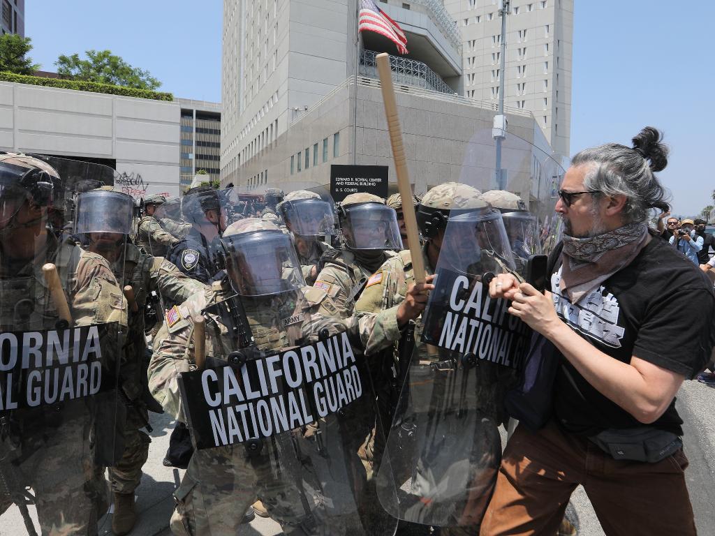 6月8日,在美國(guó)加利福尼亞州洛杉磯市中心的聯(lián)邦執(zhí)法機(jī)構(gòu)門(mén)前,抗議者與國(guó)民警衛(wèi)隊(duì)人員發(fā)生沖突。新華社發(fā)(邱晨攝)