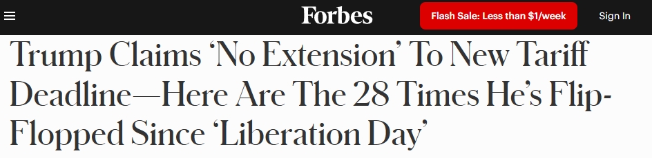 對于此次關(guān)稅調(diào)整,《福布斯》雜志網(wǎng)站7日報道指出,從今年2月7日首次公開提及對他國進(jìn)口商品征收全面關(guān)稅,到強(qiáng)調(diào)“2025年8月1日這一日期不會有任何延長”的這五個月里,特朗普政府在關(guān)稅問題上的態(tài)度“翻轉(zhuǎn)”了大約28次。