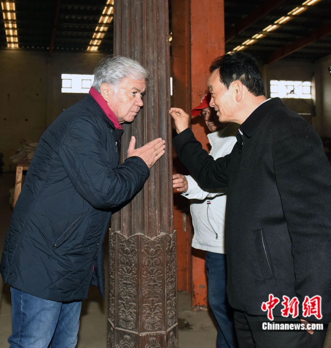 2018年11月7日,拉希德·阿利莫夫(左一)作為時(shí)任上合組織秘書長(zhǎng),來到安徽蚌埠“湖上升明月”中華古民居博覽園參觀考察。圖為拉希德·阿利莫夫在細(xì)細(xì)傾聽來自敲打老木頭的聲音。中新社發(fā) 鐘欣 攝