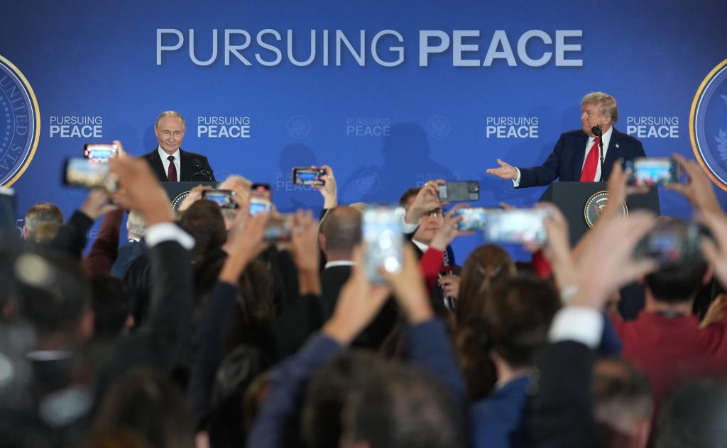 8月15日,美國總統(tǒng)特朗普(右)與俄羅斯總統(tǒng)普京在美國阿拉斯加州安克雷奇市埃爾門多夫-理查森聯合軍事基地舉行會晤后共同出席聯合記者會。新華社記者吳曉凌攝