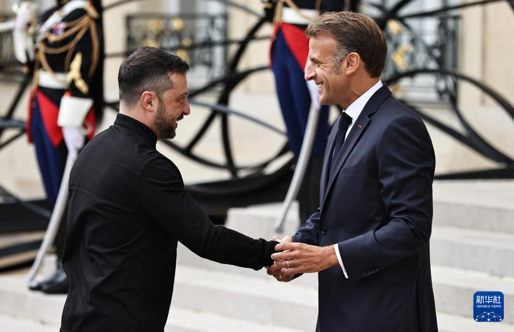9月4日,在法國首都巴黎的總統(tǒng)府愛麗舍宮,法國總統(tǒng)馬克龍(右)迎接出席“志愿聯(lián)盟”線上會議的烏克蘭總統(tǒng)澤連斯基。新華社記者 高靜 攝