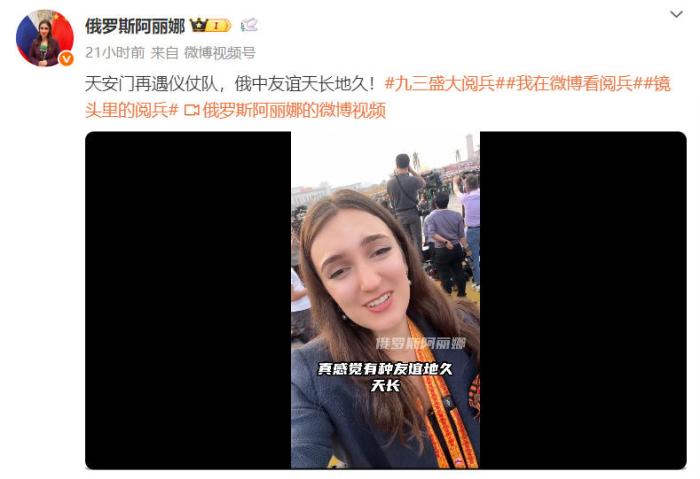 十年后,阿麗娜終于圓夢(mèng),來到了北京。九三閱兵當(dāng)天,阿麗娜在社交媒體上接連發(fā)布多條帖文,并用中文表達(dá)了自己的開心,“中國軍人太帥了”“俄中友誼天長地久”!