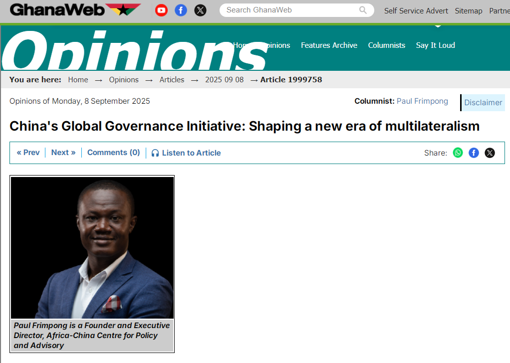 加納新聞網(wǎng)站“Ghana Web”9月8日刊發(fā)加納非中政策咨詢中心執(zhí)行主任保羅·弗林蓬的署名文章《中國全球治理倡議:塑造多邊主義新時代》,對中國提出的全球治理倡議予以高度評價。