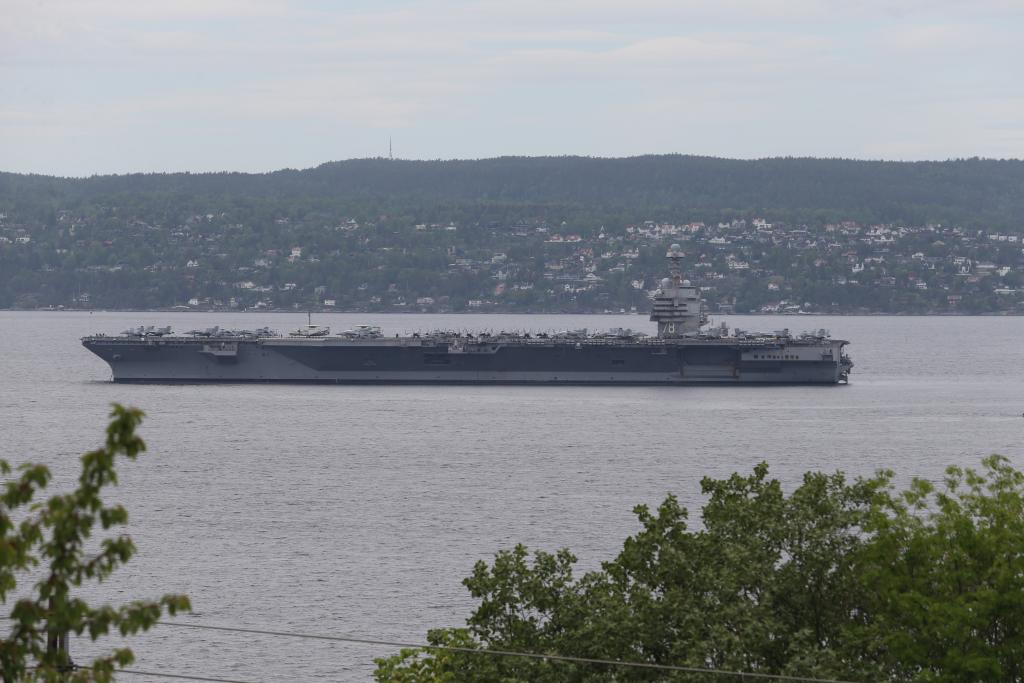 2023年5月24日,美國“杰拉爾德·R·福特”級航空母艦首艦“福特”號??吭谂餐锥紛W斯陸的峽灣中。新華社記者張玉亮攝