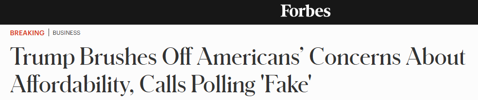 福布斯新聞網(wǎng)站報(bào)道稱,本月早些時(shí)候的調(diào)查顯示,超過(guò)四分之三的美國(guó)人對(duì)個(gè)人財(cái)務(wù)狀況感到憂慮,而政府卻質(zhì)疑民調(diào)的真實(shí)性,稱其為“虛假信息”。然而,多數(shù)民眾正經(jīng)歷的是物價(jià)上漲帶來(lái)的支出增加。盡管特朗普政府宣稱“生活成本已大幅下降”,但電費(fèi)、家具、電子產(chǎn)品及食品雜貨等價(jià)格自其就職以來(lái)便普遍上漲。