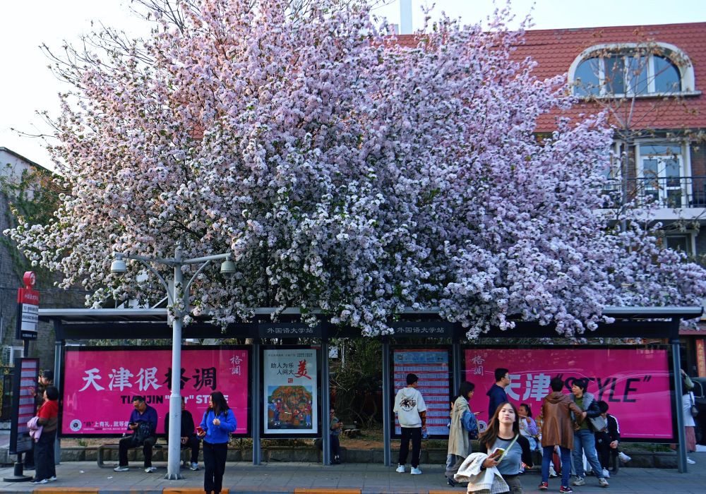 位于天津五大道馬場(chǎng)道的天津外國(guó)語(yǔ)大學(xué)公交站旁的海棠花盛開(4月6日攝)。