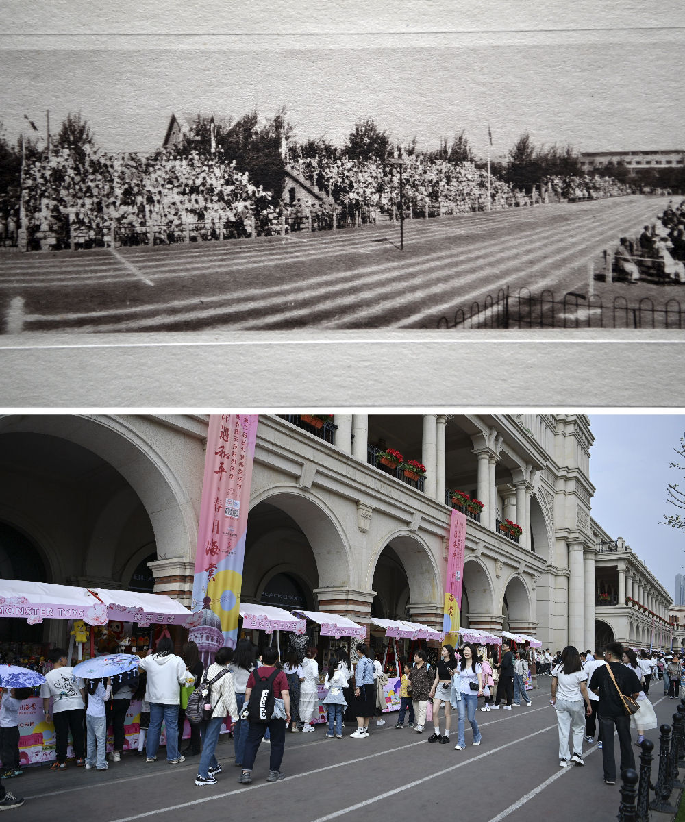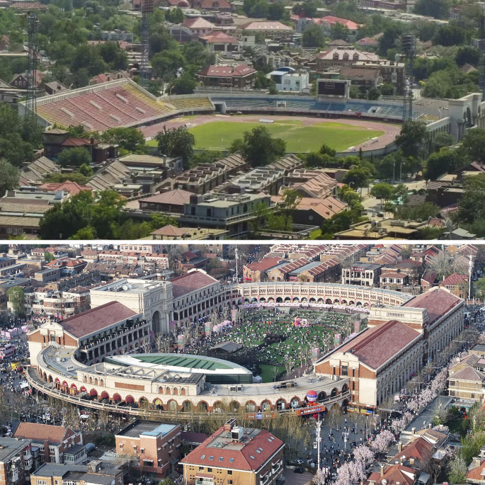 拼版照片:上圖是位于五大道的民園體育場(chǎng)(資料照片);下圖是位于五大道的民園廣場(chǎng)(4月6日攝)。民園廣場(chǎng)的前身是始建于1920年的民園體育場(chǎng),這里也是中國(guó)的第一個(gè)燈光足球場(chǎng)。經(jīng)過(guò)提升改造,現(xiàn)在的民園廣場(chǎng)已經(jīng)成為中西合璧的“城市會(huì)客廳”。