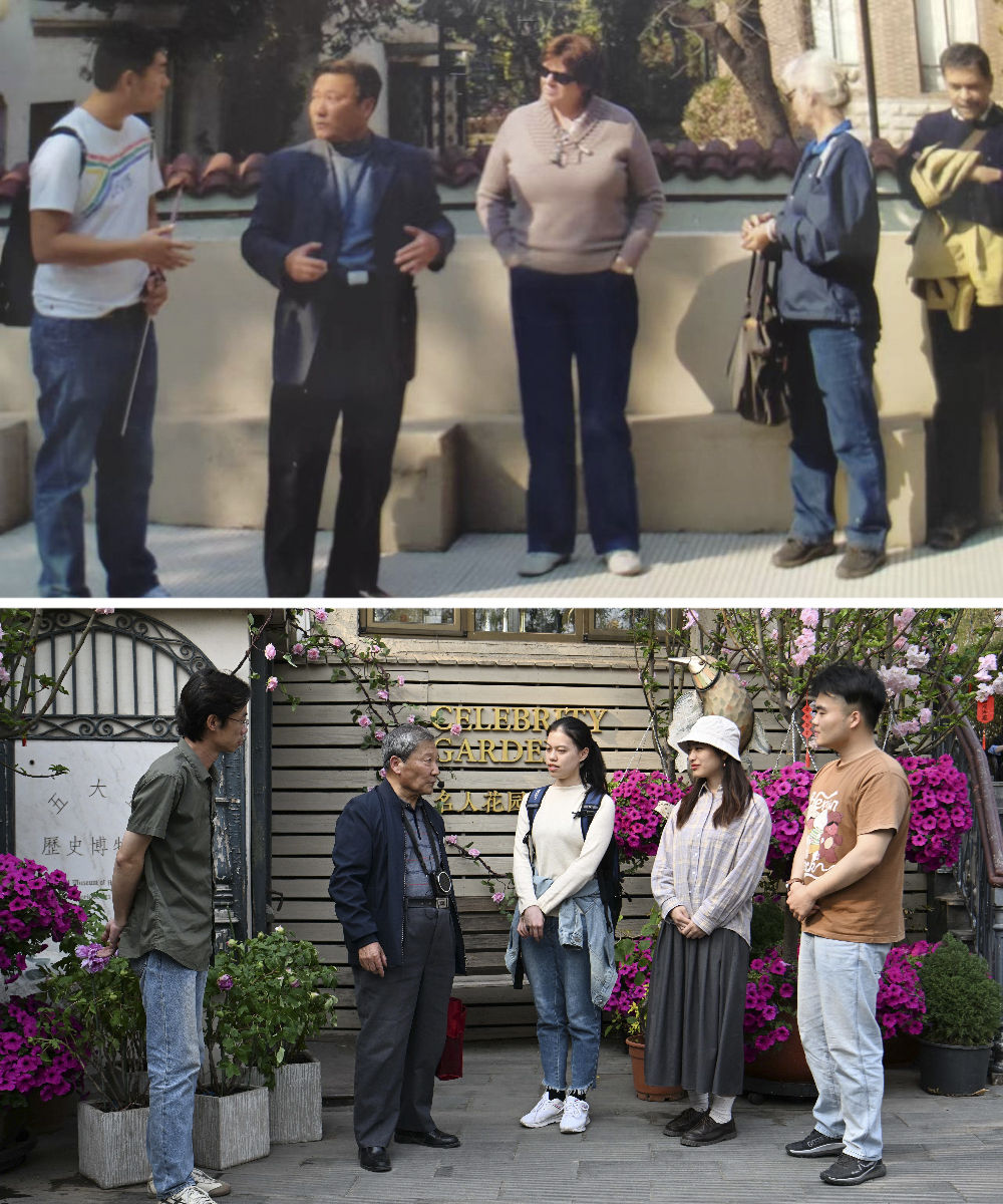 拼版照片:上圖是2011年金彭育(左二)在五大道和平賓館義務(wù)為外國(guó)游客講解;下圖是金彭育(左二)在五大道上為游客義務(wù)講解(4月13日攝)。