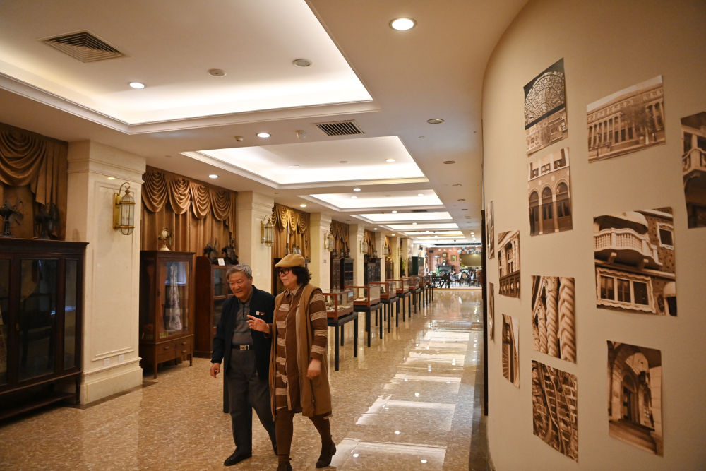 在五大道歷史博物館,金彭育(左)和館長(zhǎng)劉春芬互相交流(4月13日攝)。