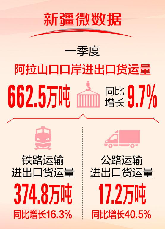 一季度,阿拉山口口岸鐵路運(yùn)輸進(jìn)出口貨運(yùn)量374.8萬噸,同比增長16.3%;公路運(yùn)輸進(jìn)出口貨運(yùn)量17.2萬噸,同比增長40.5%。公路、鐵路進(jìn)出口貨運(yùn)量均呈現(xiàn)穩(wěn)步上升的局面。