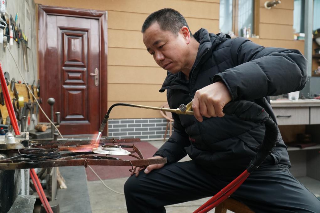 王富邦居住的青海省西寧市湟中區(qū)魯沙爾鎮(zhèn)陽(yáng)坡村,是湟中“銀銅器制作及鎏金技藝”發(fā)祥地。100多年前,這里因緊鄰藏傳佛教名寺塔爾寺而成為銀銅器匠人的聚居地。王富邦介紹說(shuō):“一開(kāi)始只是外來(lái)的漢族匠人鍛造宗教器物,后來(lái)本地的漢、藏、土族群眾也加入進(jìn)來(lái),村莊因‘家家有作坊’而逐漸揚(yáng)名?!?/p>