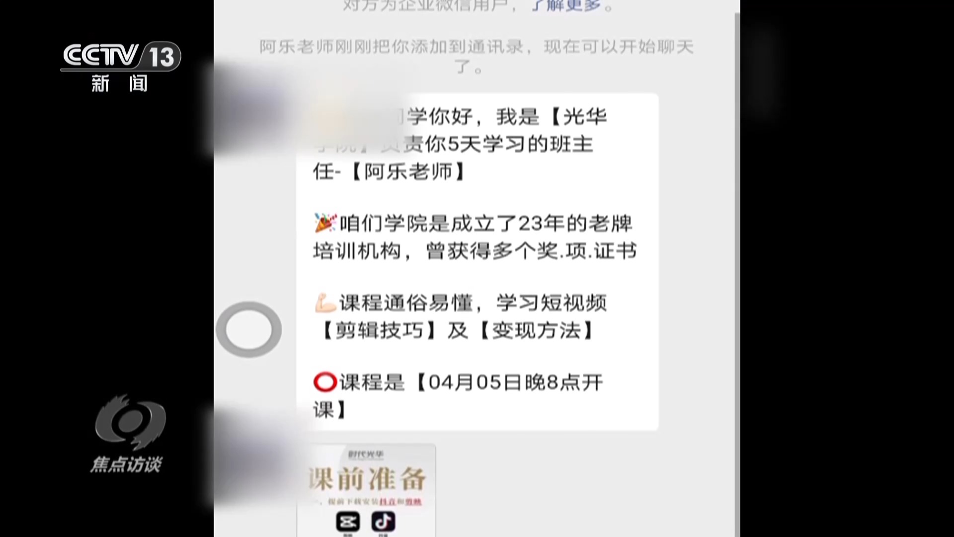 黃先生的遭遇并不是個案。記者瀏覽多個網(wǎng)絡(luò)平臺,發(fā)現(xiàn)類似的廣告比比皆是,五花八門,0元學(xué)配音、0元學(xué)書法、0元學(xué)易經(jīng)……記者隨機點開了一家賬號主體為北京時代光華科技有限公司的0元5天剪輯直播課,添加所謂的老師微信之后就被拉進了一個微信群,4月5日晚上8點,課程開始了。