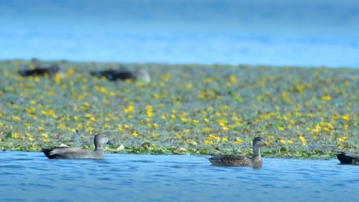 汾河介休段,綠頭鴨、赤麻鴨在水中暢游。介休市委宣傳部供圖