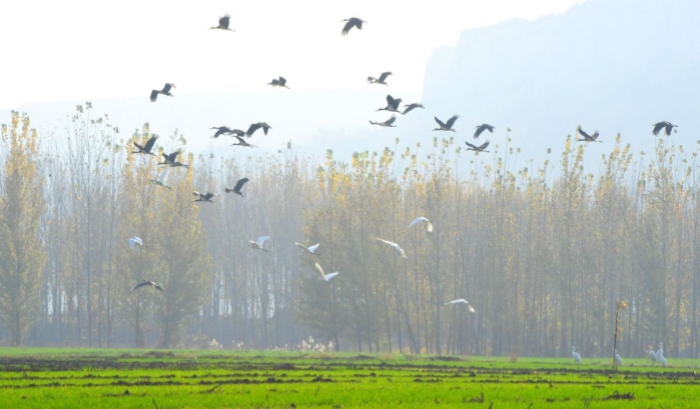 圖為山西稷山汾河國家濕地公園白鷺與黑鸛齊飛。栗盧建 攝
