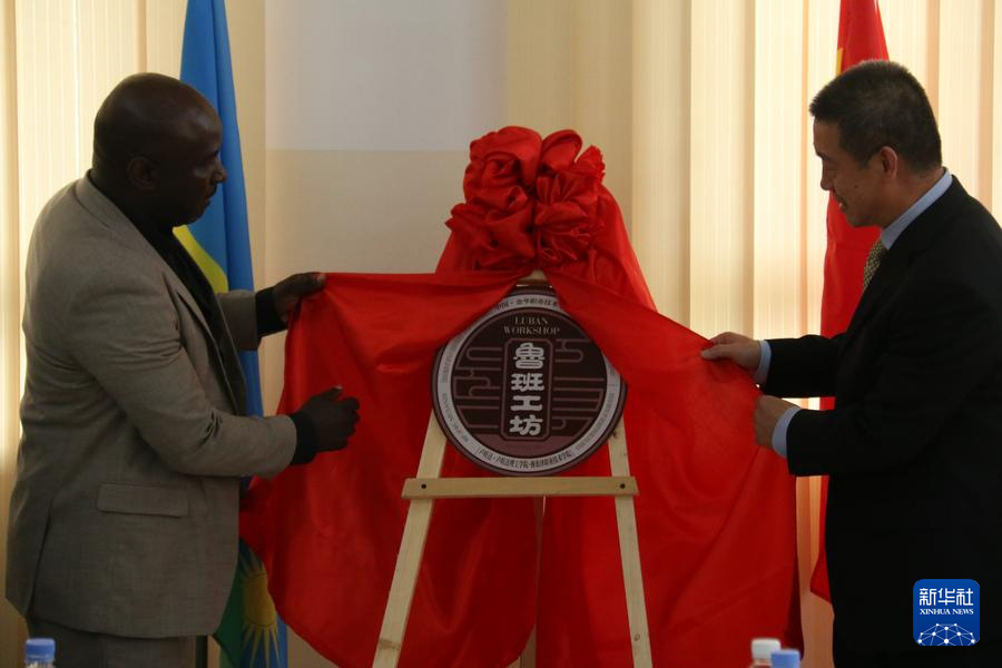2023年11月18日,在盧旺達(dá)北方省穆桑澤職業(yè)技術(shù)學(xué)院,中國(guó)駐盧旺達(dá)大使王雪坤(右)與盧旺達(dá)北方省省長(zhǎng)莫里斯·穆加博瓦加洪德共同為盧旺達(dá)魯班工坊揭牌。新華社發(fā)(黃萬晴攝)