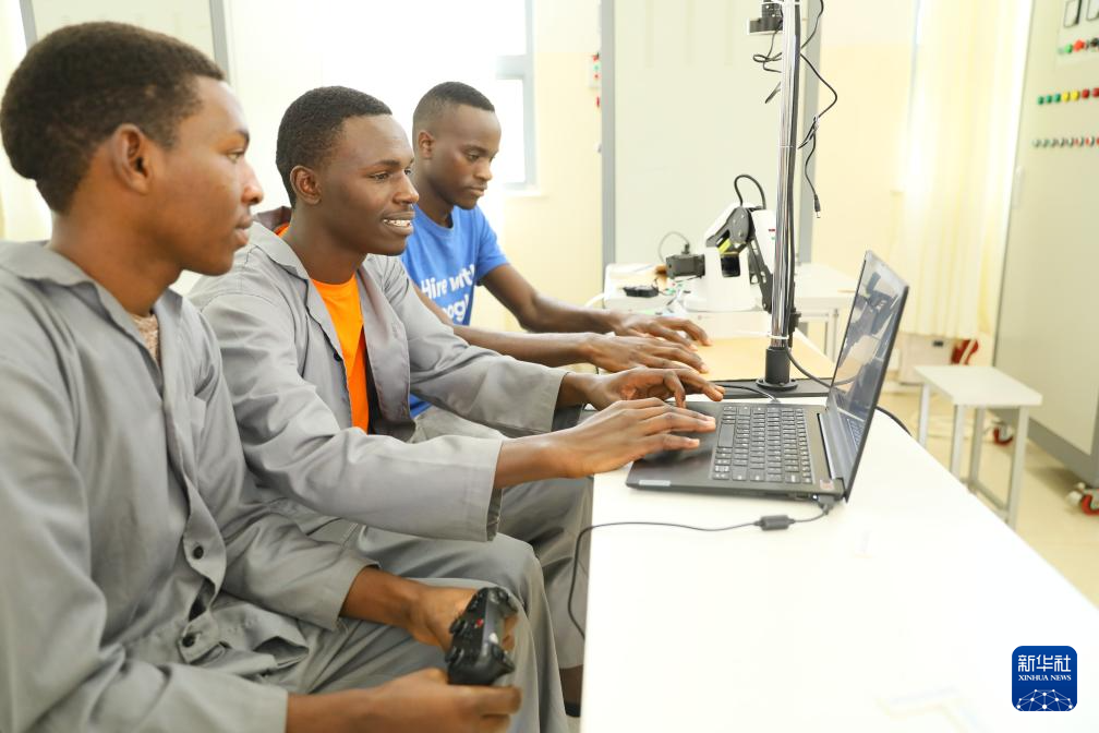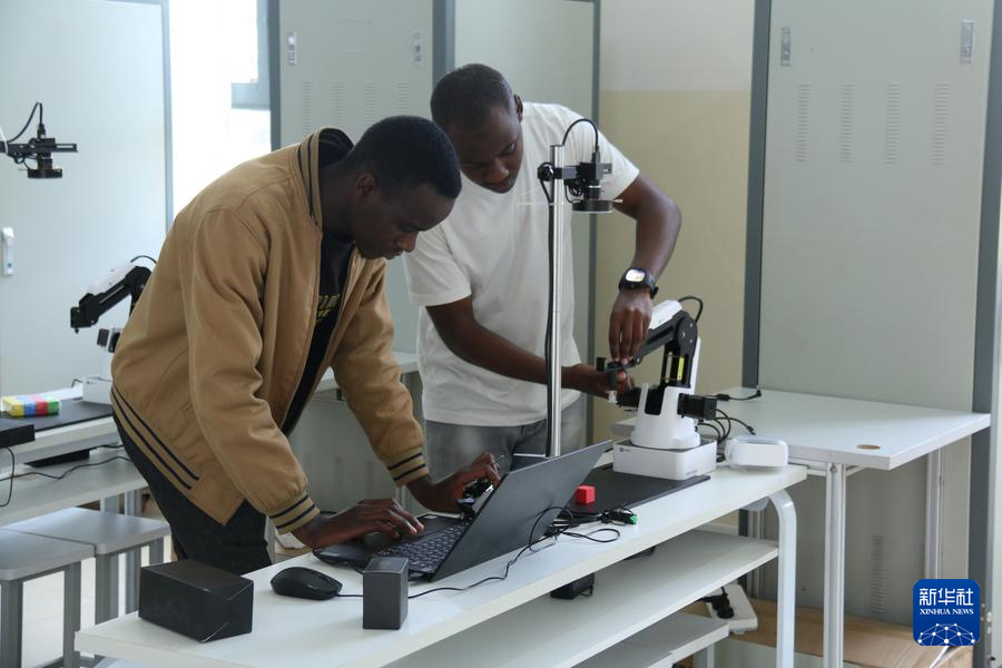 2023年11月18日,在盧旺達(dá)北方省穆桑澤職業(yè)技術(shù)學(xué)院魯班工坊的實(shí)驗(yàn)室中,兩名當(dāng)?shù)貙W(xué)生操作儀器。新華社發(fā)(黃萬晴攝)
