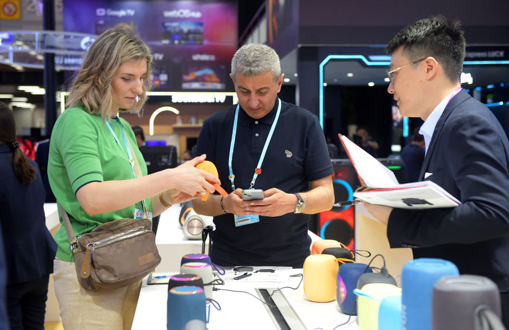 4月15日,客商在廣交會展館內(nèi)選購音箱。(盧漢欣 攝)