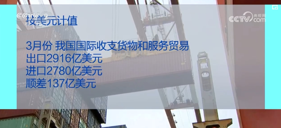 國家外匯管理局發(fā)布數(shù)據(jù),3月份,我國國際收支貨物和服務(wù)貿(mào)易進出口規(guī)模為40430億元,同比增長3%。其中,貨物貿(mào)易出口18556億元、進口16053億元;服務(wù)貿(mào)易出口2144億元、進口3677億元。按美元計值,3月份,我國國際收支貨物和服務(wù)貿(mào)易出口2916億美元、進口2780億美元、順差137億美元。