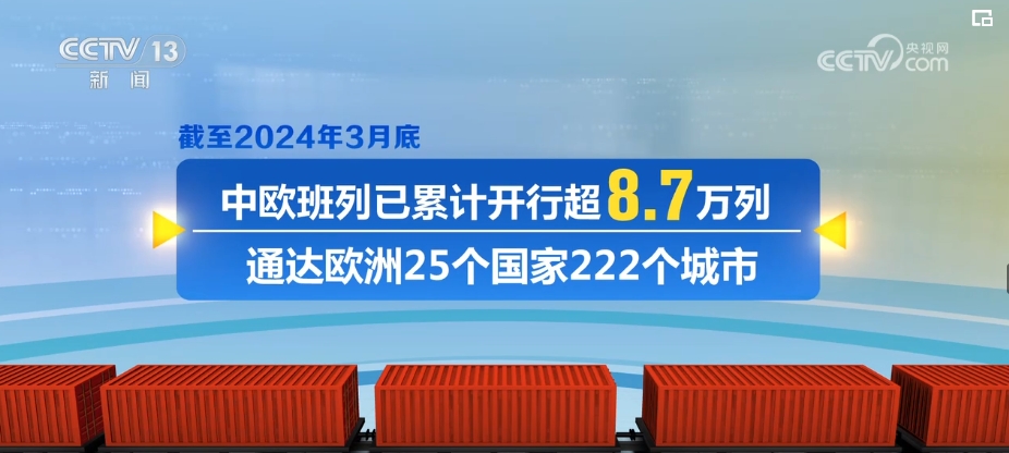 2024年一季度,中歐班列累計開行4541列、發(fā)送貨物49.3萬標(biāo)箱,同比分別增長9%、10%。截至2024年3月底,中歐班列已累計開行超8.7萬列,通達(dá)歐洲25個國家222個城市。