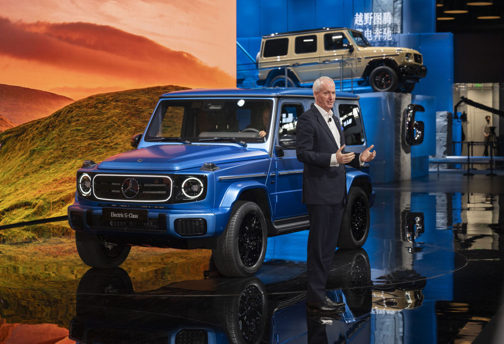 4月25日,在北京中國(guó)國(guó)際展覽中心順義館舉行的2024北京車(chē)展上,梅賽德斯—奔馳集團(tuán)股份公司董事會(huì)成員唐仕凱介紹梅賽德斯—奔馳純電G級(jí)越野車(chē)。新華社記者才揚(yáng)攝