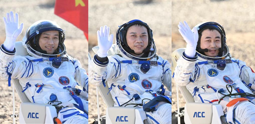 4月30日,神舟十七號航天員湯洪波(中)、唐勝杰(右)、江新林安全順利出艙。(拼版照片)