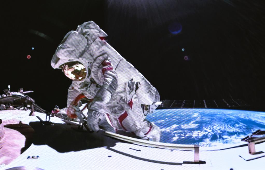 2024年3月2日,在北京航天飛行控制中心拍攝的神舟十七號航天員湯洪波在空間站組合體艙外作業(yè)。
