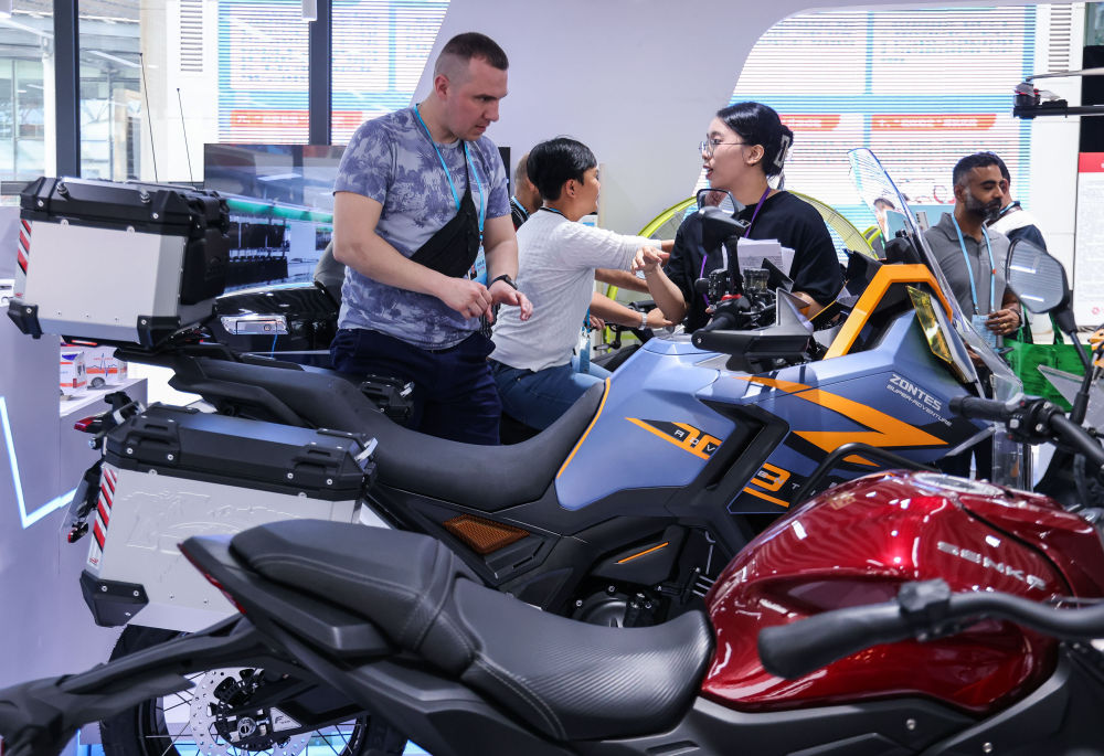 2024年4月15日,采購(gòu)商在第135屆廣交會(huì)上了解摩托車產(chǎn)品。新華社記者 劉大偉 攝